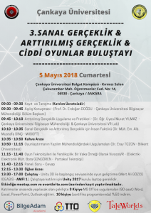 Çankaya Üniversitesi tarafından bu sene üçüncüsü düzenlenen “SANAL GERÇEKLİK & ARTTIRILMIŞ GERÇEKLİK & CİDDİ OYUNLAR BULUŞTAYI” Çankaya Üniversitesi Balgat Kampüsü – Kırmızı Salon’da gerçekleştirilecektir. Buluştayın ilk bölümünde sektörün önde gelen isimleri tarafından sektördeki fırsatları ve yeni teknolojileri anlatan sunumlar yapılacaktır. İkinci bölümde Sanal Gerçeklik konusunda çalışan bir yazılım uzmanı tarafından Unity 3D ile başlangıç seviyesinde oyun geliştirme eğitimi verilecektir.
