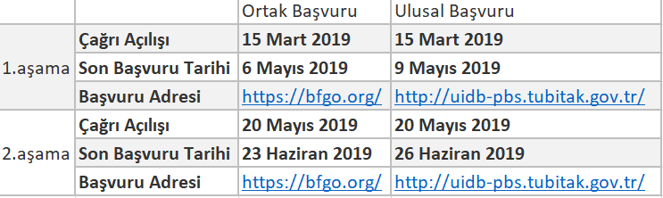Uluslararası başvuru ile birlikte ulusal başvuru da yapılması gerekmektedir. Bu kapsamda, Türkiye’de yerleşik kamu ve özel sektörden araştırmacılar başvurularını http://uidb-pbs.tubitak.gov.tr/ adresinden yapabilirler.